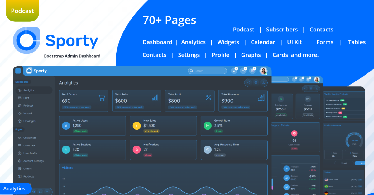 Sporty is a Bootstrap 5 admin dark dashboard template designed with a clean, modern, and lightweight layout. It’s built to help developers and businesses create professional-looking dashboards quickly without the need for heavy backend coding. With responsive pages, reusable components, and a structured codebase, Sporty is perfect for web apps, …