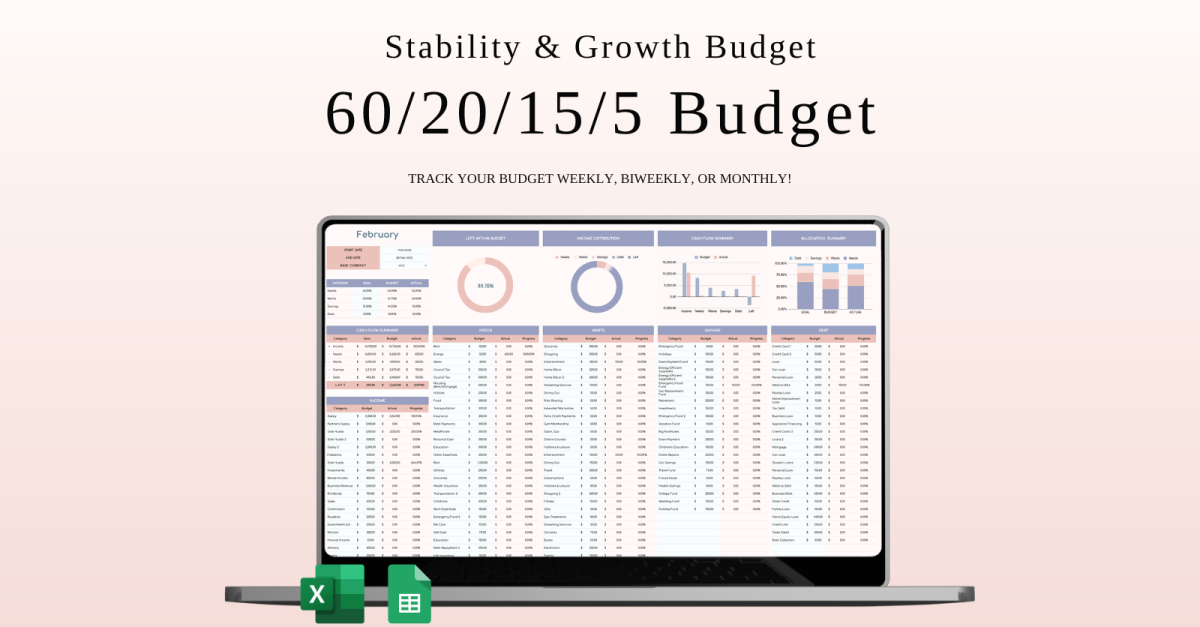 The 60/20/15/5 Stability & Growth Budget offers a smart, straightforward approach to managing your finances — balancing your essential needs with future goals and a bit of everyday enjoyment. It’s designed for anyone aiming to build lasting financial stability without giving up the things that make life enjoyable. Budget Breakdown: …